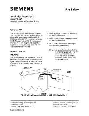 Installation Manual for the Siemens PS-5N7. Document No: 315-092729-13, Rev: 6. Model PS-5N7. Mounting instructions, wiring diagrams, and system power-up procedures.