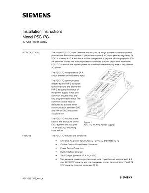 Installation Manual for the Siemens PSC-17C, published in 2011. Document No: A6V10881202, Rev: a. Model PSC-17C. Hardware installation, terminal connections, and environmental requirements.