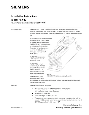 Installation Manual for the Siemens PSX-12. Document No: 315-048553-5. Model PSX-12. Mounting instructions, wiring diagrams, and system power-up procedures.