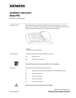 Installation Manual for the Siemens PTB. Document No: 315-034877-4, Rev: 4. Model PTB. Mounting instructions, wiring diagrams, and system power-up procedures.