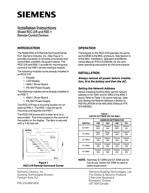 Installation Manual for the Siemens RCC-2, RCC-R and RSE-1. Document No: 315-099160-8, Rev: ision. Models RCC-2, RCC-R and RSE-1. Physical installation guide, backbox dimensions, and cabling specifications.