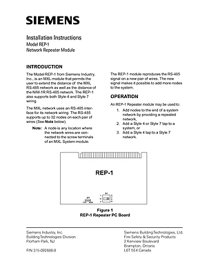 Installation Manual for the Siemens REP-1. Document No: 315-092686-8, Rev: 6. Model REP-1. Hardware installation, terminal connections, and environmental requirements.