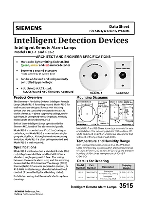 Datasheet for the Siemens RLI-1 and RLI-2, published in 2013. Document No: 3515, Rev: 2. Models RLI-1 and RLI-2. Product features, environmental operating limits, and compatibility data.
