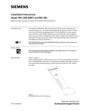 Installation Manual for the Siemens RNI-CAB-BRKT and RNI-CBL (Canadian). Document No: 315-050062-3, Rev: 3. Models RNI-CAB-BRKT and RNI-CBL. Mounting instructions, wiring diagrams, and system power-up procedures.