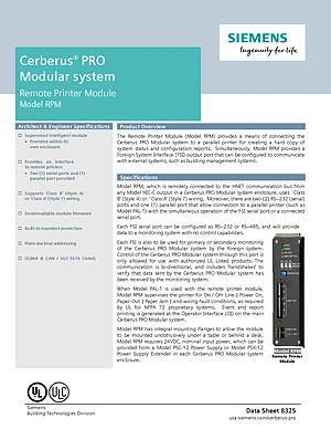 Datasheet for the Siemens RPM for Cerberus PRO Modular, published in 2017. Document No: 8325, Rev: 0. Model RPM. Product features, environmental operating limits, and compatibility data.