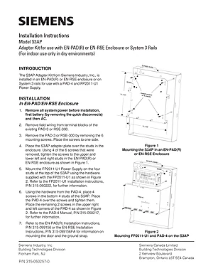 Installation Manual for the Siemens S3AP (Canadian). Document No: 315-050257-0, Rev: 0. Model S3AP. Physical installation guide, backbox dimensions, and cabling specifications.