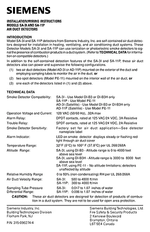 Installation and Wiring Diagram for the Siemens SA-3I and SA-11P Air Duct Detectors. Document No: 315-096274-4, Rev: 4. Models SA-3I and SA-11P. Mounting instructions, terminal connections, and system wiring layouts.