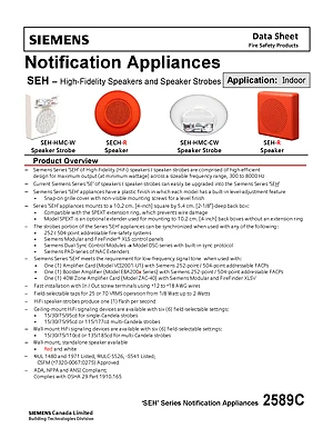 Datasheet for the Siemens SEH High-Fidelity Speakers and Speaker Strobes (Canadian), published in 2018. Document No: 2589C, Rev: Rev. 6. 17 models including SEH, SEH-HMC-W, SEH-R and 14 additional variants. Product features, environmental operating limits, and compatibility data.