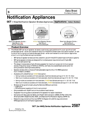 Datasheet for the Siemens SET Mass Notification Speaker-Strobes, published in 2014. Document No: 2587, Rev: 2. 8 models including SET-AMC-W-MNS-ALERT, SET-AMC-CW-MNS-ALERT, SET-AMC-R-MNS-ALERT and 5 additional variants. Detailed technical specifications, electrical ratings, and agency listings.