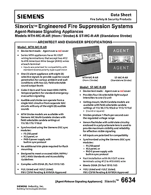 Datasheet for the Siemens Sinorix Agent-Release Appliances, published in 2011. Document No: 6634, Rev: 2. Models MTH-MC-R-AR and ST-MC-R-AR. Detailed technical specifications, electrical ratings, and agency listings.