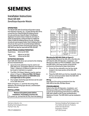 Installation Manual for the Siemens SZE-8AX for SXL-EX. Document No: 315-096022-8. Model SZE-8AX. Hardware installation, terminal connections, and environmental requirements.