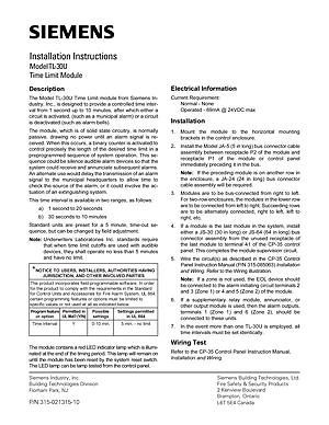 Installation Manual for the Siemens TL-30U. Document No: 315-021315-10. Model TL-30U. Physical installation guide, backbox dimensions, and cabling specifications.
