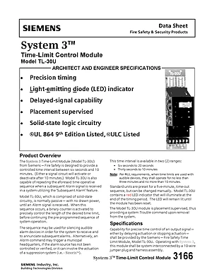 Datasheet for the Siemens TL-30U for System 3, published in 2011. Document No: 3166, Rev: Rev.1. Model TL-30U. Detailed technical specifications, electrical ratings, and agency listings.