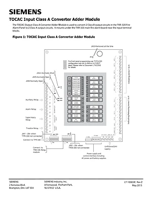 Installation and Wiring Diagram for the Siemens TOCAC for TXR-320, published in 2013. Document No: LT-1006SIE, Rev: Rev 2. Model TOCAC. Hardware setup guide paired with comprehensive electrical diagrams.