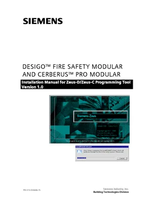 Installation Manual for the Siemens Zeus Programming Tool Version 1.0, published in 2018. Document No: 315-034686-15, Rev: 15. Models Zeus-D and Zeus-C. Physical installation guide, backbox dimensions, and cabling specifications.