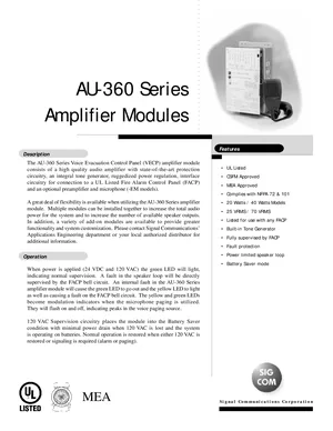 Datasheet for the SigCom AU-360 Series. Document No: 999-0165, Rev: A. 15 models including AU-360, AU-367, AU-380 and 12 additional variants. Engineering specifications, wiring diagrams, and mounting dimensions.