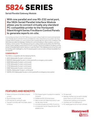 Datasheet for the Silent Knight 5824, published in 2019. Document No: 350208, Rev: F. 9 models including 5824, 6820, 6820EVS and 6 additional variants. Engineering specifications, wiring diagrams, and mounting dimensions.
