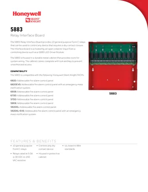 Datasheet for the Silent Knight 5883, published in 2017. Document No: 350311, Rev: E. 10 models including 5883, 5880, 6820 and 7 additional variants. Engineering specifications, wiring diagrams, and mounting dimensions.