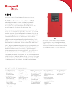 Datasheet for the Silent Knight 6808, published in 2017. Document No: 351608, Rev: A. 104 models including 6808, 6860, 5860 and 101 additional variants. Product features, environmental operating limits, and compatibility data.