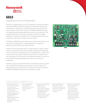 Datasheet for the Silent Knight 6815, published in 2017. Document No: 351628, Rev: A. 8 models including 6815, 6820, 6820EVS and 5 additional variants. Product features, environmental operating limits, and compatibility data.