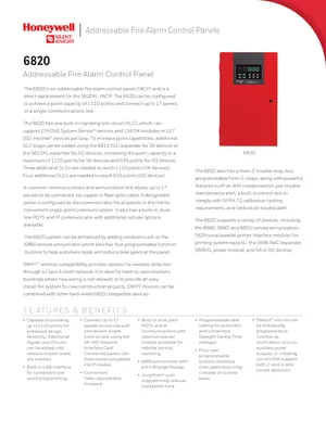 Datasheet for the Silent Knight 6820, published in 2018. Document No: 351610, Rev: B. 125 models including 6820, 5820XL, 6815 and 122 additional variants. Product features, environmental operating limits, and compatibility data.