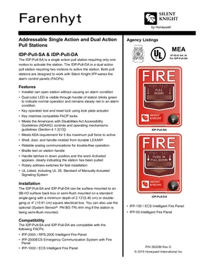 Datasheet for the Silent Knight Addressable Pull Stations, published in 2015. Document No: 350286, Rev: G. 12 models including IDP-Pull-SA, IDP-Pull-DA, IFP-2000 and 9 additional variants. Product features, environmental operating limits, and compatibility data.