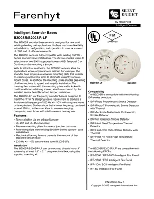 Datasheet for the Silent Knight B200SR, published in 2015. Document No: 350266, Rev: D. 14 models including B200SR, B200SR-LF, IDP-Photo and 11 additional variants. Engineering specifications, wiring diagrams, and mounting dimensions.