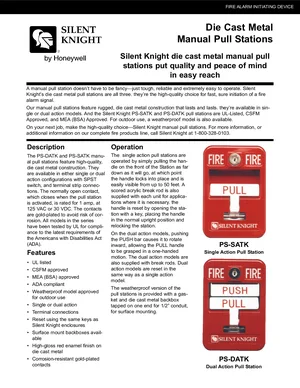 Datasheet for the Silent Knight Die Cast Metal Manual Pull Stations, published in 2014. Document No: 350792, Rev: C. Models PS-SATK and PS-DATK. Engineering specifications, wiring diagrams, and mounting dimensions.