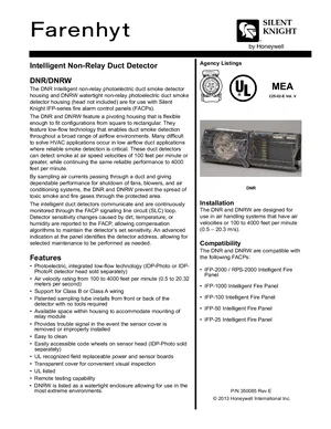 Datasheet for the Silent Knight DNR and DNRW, published in 2013. Document No: 350085, Rev: E. 20 models including DNR, DNRW, IDP-Photo and 17 additional variants. Detailed technical specifications, electrical ratings, and agency listings.