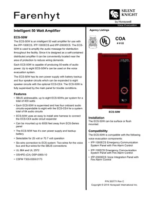 Datasheet for the Silent Knight ECS-50W, published in 2014. Document No: 350771, Rev: C. 9 models including ECS-50W, ECS-50WHV, ECS-CE4 and 6 additional variants. Detailed technical specifications, electrical ratings, and agency listings.