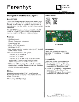 Datasheet for the Silent Knight ECS-INT50W, published in 2015. Document No: 350980, Rev: A. 4 models including ECS-INT50W, IFP-2000ECS, IFP-1000ECS and 1 additional variants. Engineering specifications, wiring diagrams, and mounting dimensions.