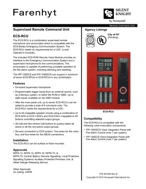 Datasheet for the Silent Knight ECS-RCU, published in 2015. Document No: 351554, Rev: D. 14 models including ECS-RCU, IFP-100ECS, IFP-1000ECS and 11 additional variants. Product features, environmental operating limits, and compatibility data.