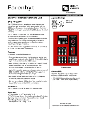 Datasheet for the Silent Knight ECS-RCU2000, published in 2014. Document No: 350709, Rev: C. 24 models including ECS-RCU2000, ECS-RVM, RA-2000 and 21 additional variants. Engineering specifications, wiring diagrams, and mounting dimensions.