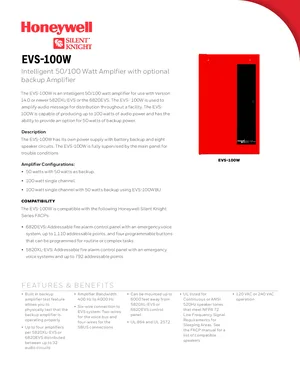Datasheet for the Silent Knight EVS-100W, published in 2018. Document No: 350961, Rev: E. 5 models including EVS-100W, EVS-100WBU, 5820XL-EVS and 2 additional variants. Engineering specifications, wiring diagrams, and mounting dimensions.