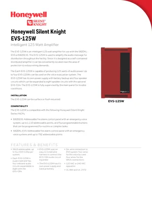 Datasheet for the Silent Knight EVS-125W Amplifier, published in 2017. Document No: 350606, Rev: B. 20 models including EVS-125W, 6820EVS, 5820XL-EVS and 17 additional variants. Detailed technical specifications, electrical ratings, and agency listings.