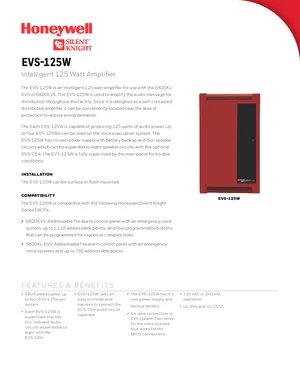 Datasheet for the Silent Knight EVS-125W Amplifier, published in 2018. Document No: 350606, Rev: B. 7 models including EVS-125W, 5820XL-EVS, 6820EVS and 4 additional variants. Product features, environmental operating limits, and compatibility data.