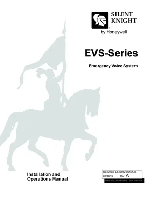 Installation and Operations Manual for the Silent Knight EVS-Series, published in 2013. Document No: LS10062-001SK-E, Rev: A. 10 models including 5820XL-EVS, EVS-RCU, EVS-SW24 and 7 additional variants. Hardware mounting, wiring, and user system management.