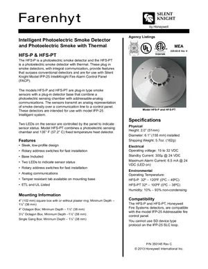 Datasheet for the Silent Knight HFS-P and HFS-PT, published in 2013. Document No: 350145, Rev: C. 9 models including HFS-P, HFS-PT, IFP-25 and 6 additional variants. Product features, environmental operating limits, and compatibility data.