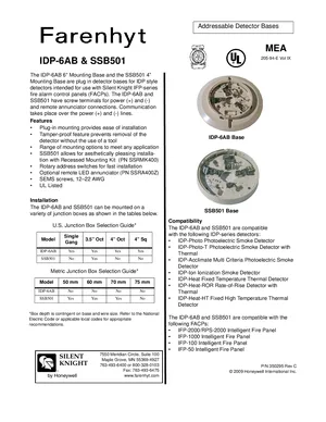 Datasheet for the Silent Knight IDP-6AB & SSB501 Bases, published in 2009. Document No: 350295, Rev: C. 23 models including IDP-6AB, SSB501, IDP-Photo and 20 additional variants. Engineering specifications, wiring diagrams, and mounting dimensions.