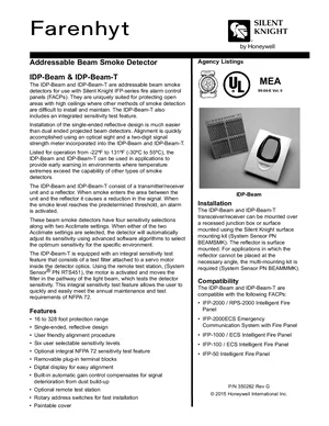 Datasheet for the Silent Knight IDP-Beam, published in 2015. Document No: 350282, Rev: G. 15 models including IDP-Beam, IDP-Beam-T, BEAMSMK and 12 additional variants. Product features, environmental operating limits, and compatibility data.