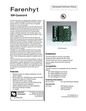 Datasheet for the Silent Knight IDP-Control-6 Module. Document No: 350294, Rev: C. 6 models including IDP-Control-6, IDP-ACB, IFP-2000 and 3 additional variants. Product features, environmental operating limits, and compatibility data.