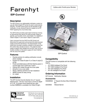 Datasheet for the Silent Knight IDP-Control Module. Document No: 350293, Rev: D. 8 models including IDP-Control, IFP-2000, IFP-1000 and 5 additional variants. Engineering specifications, wiring diagrams, and mounting dimensions.