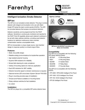 Datasheet for the Silent Knight IDP-Ion, published in 2013. Document No: 350283, Rev: F. 18 models including IDP-Ion, B210LP, B501 and 15 additional variants. Detailed technical specifications, electrical ratings, and agency listings.