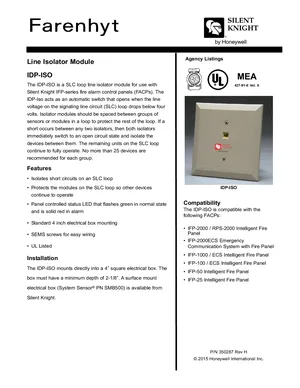 Datasheet for the Silent Knight IDP-ISO, published in 2015. Document No: 350287, Rev: H. 9 models including IDP-ISO, SMB500, IFP-2000 and 6 additional variants. Detailed technical specifications, electrical ratings, and agency listings.