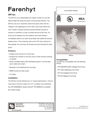 Datasheet for the Silent Knight IDP-Iso Isolator Module, published in 2009. Document No: 350287, Rev: D. 8 models including IDP-Iso, IFP-2000, RPS-2000 and 5 additional variants. Product features, environmental operating limits, and compatibility data.