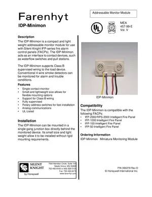 Datasheet for the Silent Knight IDP-Minimon Monitor. Document No: 350279, Rev: D. 6 models including IDP-Minimon, IFP-2000, RPS-2000 and 3 additional variants. Engineering specifications, wiring diagrams, and mounting dimensions.