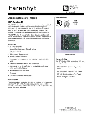 Datasheet for the Silent Knight IDP-Monitor-10, published in 2013. Document No: 350296, Rev: E. 7 models including IDP-Monitor-10, IFP-2000, RPS-2000 and 4 additional variants. Engineering specifications, wiring diagrams, and mounting dimensions.