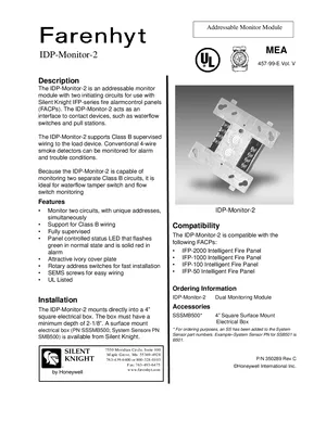 Datasheet for the Silent Knight IDP-Monitor-2 Module. Document No: 350289, Rev: C. 7 models including IDP-Monitor-2, IFP-2000, IFP-1000 and 4 additional variants. Engineering specifications, wiring diagrams, and mounting dimensions.