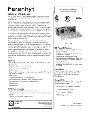 Datasheet for the Silent Knight IDP-Pduct Duct Detectors, published in 2008. Document No: 350284, Rev: D. 24 models including IDP-Pduct, IDP-Pduct-R, SSST-1.5 and 21 additional variants. Engineering specifications, wiring diagrams, and mounting dimensions.