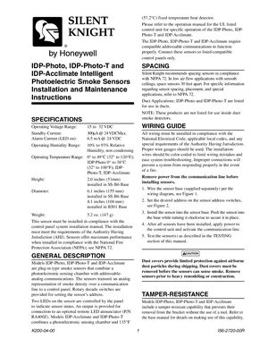 Installation Manual for the Silent Knight IDP-Photo and IDP-Acclimate, published in 2005. Document No: I56-2720-00R, Rev: 00R. 8 models including IDP-Photo, IDP-Photo-T, IDP-Acclimate and 5 additional variants. Hardware installation, terminal connections, and environmental requirements.